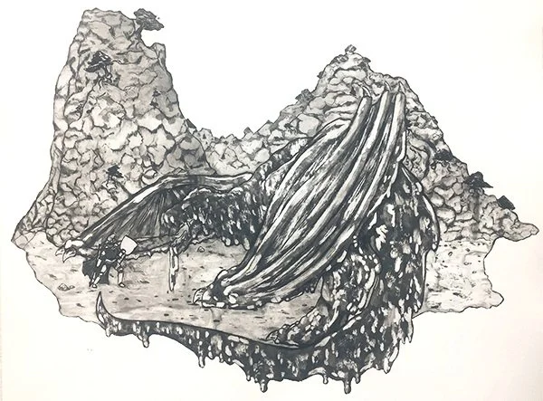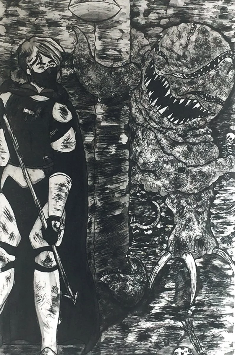 Printmaking Knight Series: Eluding the Monster, Battle of the Ink Dragon, and Wise Council. Intaglio. This series represents some of the challenges faced while earning a BFA during a global pandemic.