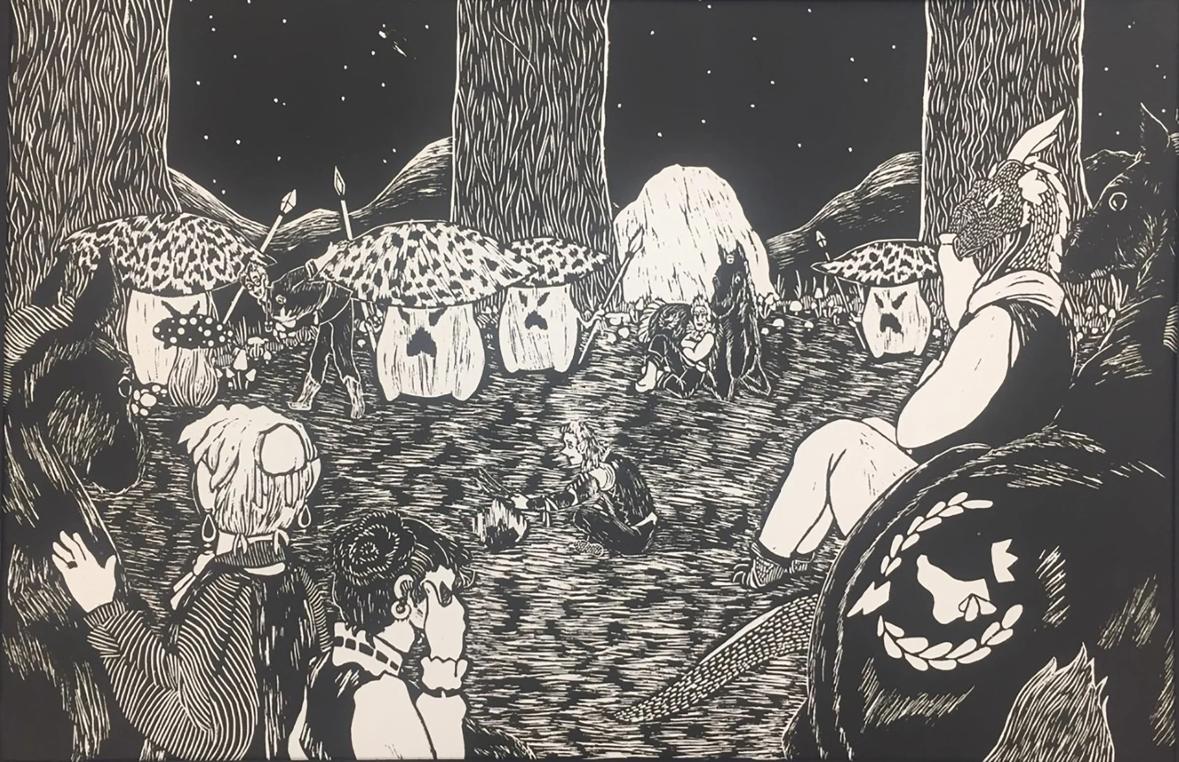 Making Conversation, Woodcut. 2’x3’ An excerpt scene from a personal Dungeons and Dragons campaign, where a player mistakenly spoke to a non-sentient mushroom instead of the very sentient mushroom people putting the company up for the night, much to the other party members’ embarrassment.